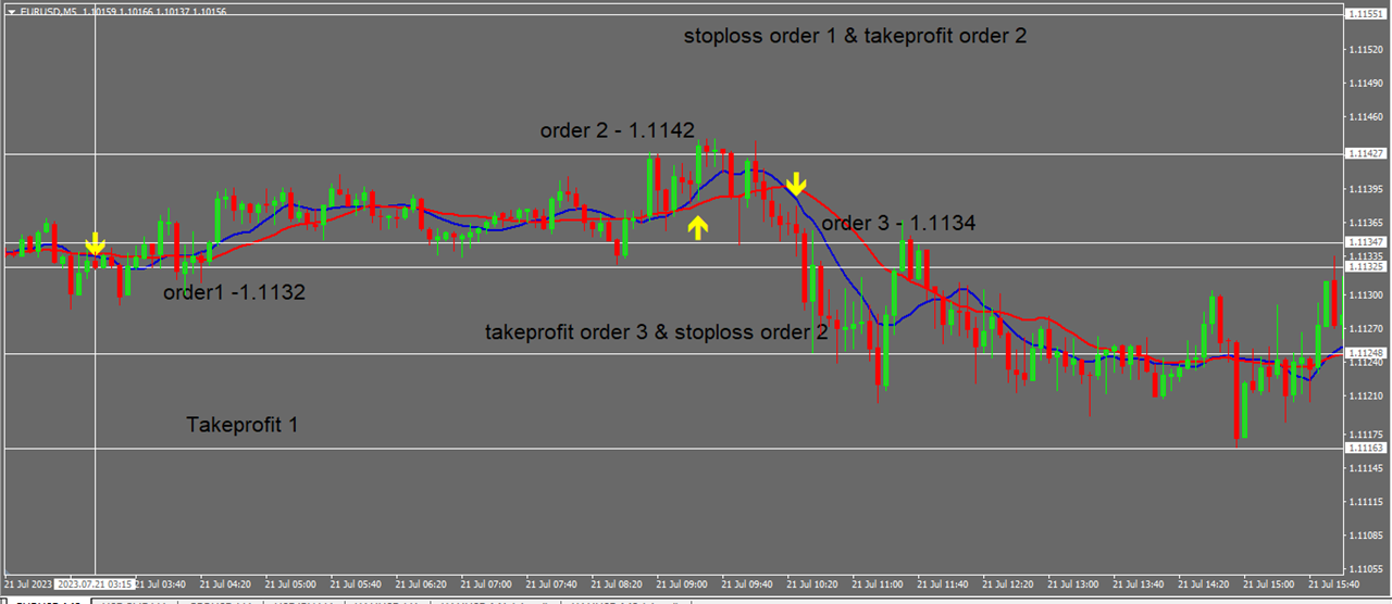 Давайте перейдем к первому случаю на таймфрейме EUR/USD M5. в 01: 15 20/7/2023. у нас есть сигнал о пересечении sma(10) и sma (20). 1 ордер на покупку 0,1 лота будет открыт по цене 1,1199. тейк-профит на отметке 1,2115 и стоп-лосс на отметке 1,1176. Отложенные ордера на продажу по цене 1.1189 фиксируют прибыль на уровне 1.1176. Я использую это для того, чтобы при открытии 2 ордеров тейк-профит 2 ордера закрывал обе сделки и по-прежнему не приносил убытков счету. Мы можем по-другому понять, что если происходит более одного заказа. зафиксируйте прибыль вместо примерно 16$, так как первый ордер будет иметь тейк-профит > = 5$ при закрытии всех ордеров, при общем количестве открытых ордеров > 1